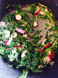 - Hacher grossièrement la ciboule, la menthe et la coriandre et les mettre dans un saladier avec les radis