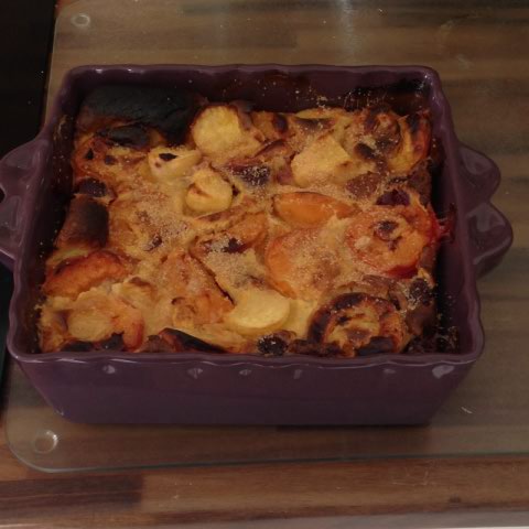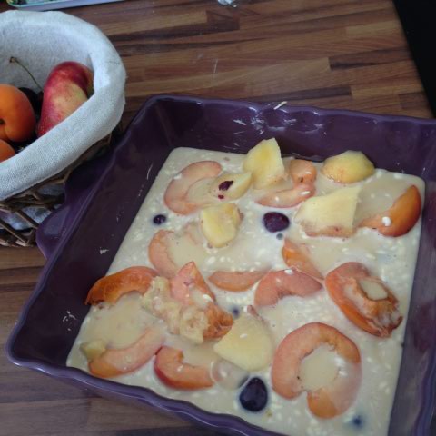 - Dans un plat à bord haut, bien beurré et fariné, disposer les fruits coupés en morceaux