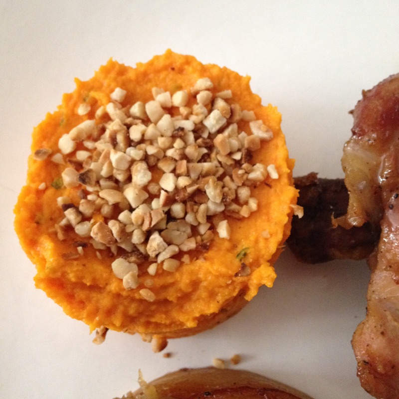 Aujourd’hui j’ai déjeuné à la table d’une jeune femme marocaine qui cuisine divinement bien. Elle nous a servi une cuisse de poulet accompagnée d’une purée de patates douces aux noisettes et une mini tarte tatin aux pommes et aux raisins sans pâte. Un délice qui a ravi nos palais en cette chaude journée de juin. N’ayant pas eu le temps de lui piquer la recette exacte, je vous la livre comme je l’imagine mais on ne doit pas être loin. Allez on tente?