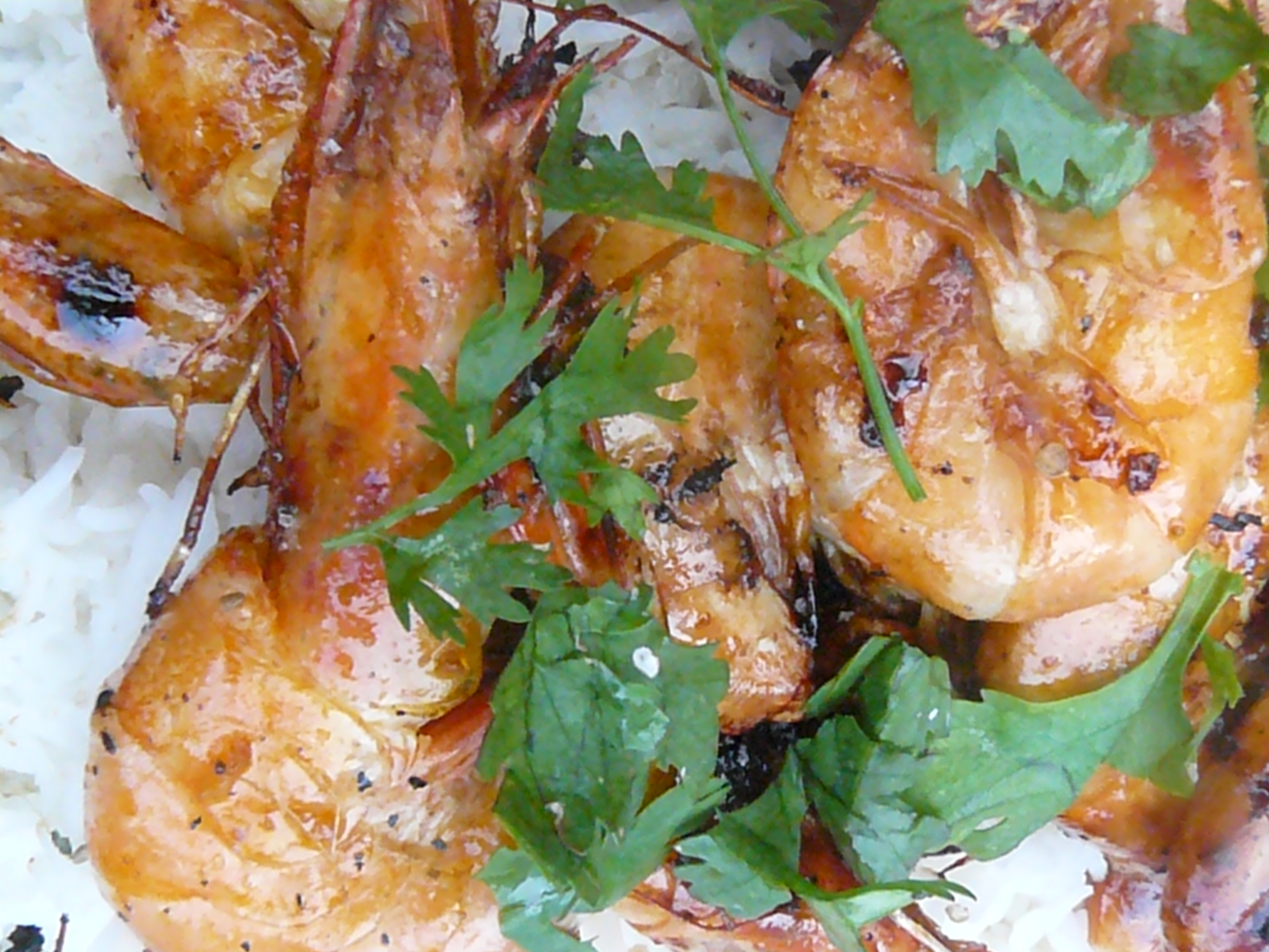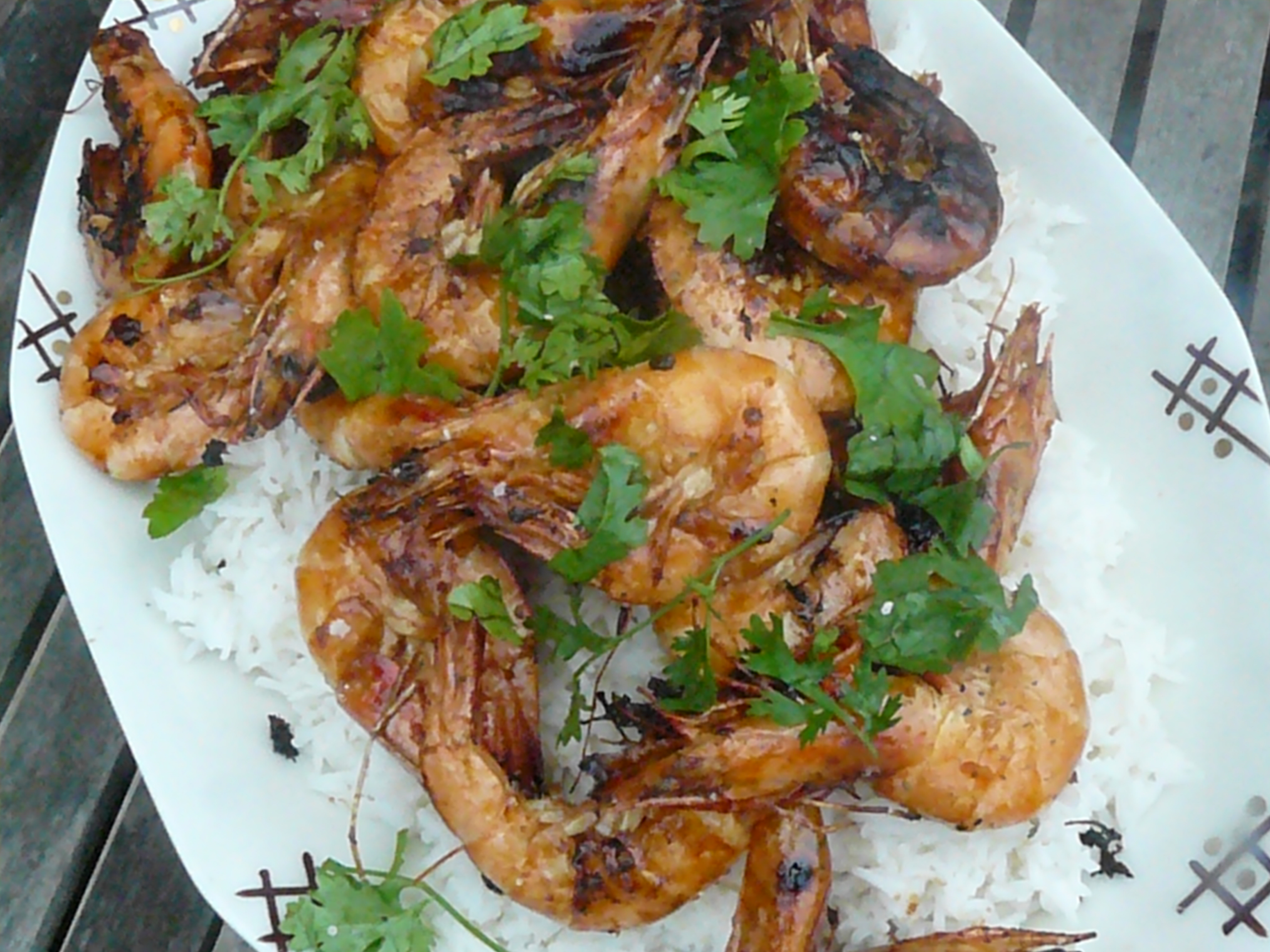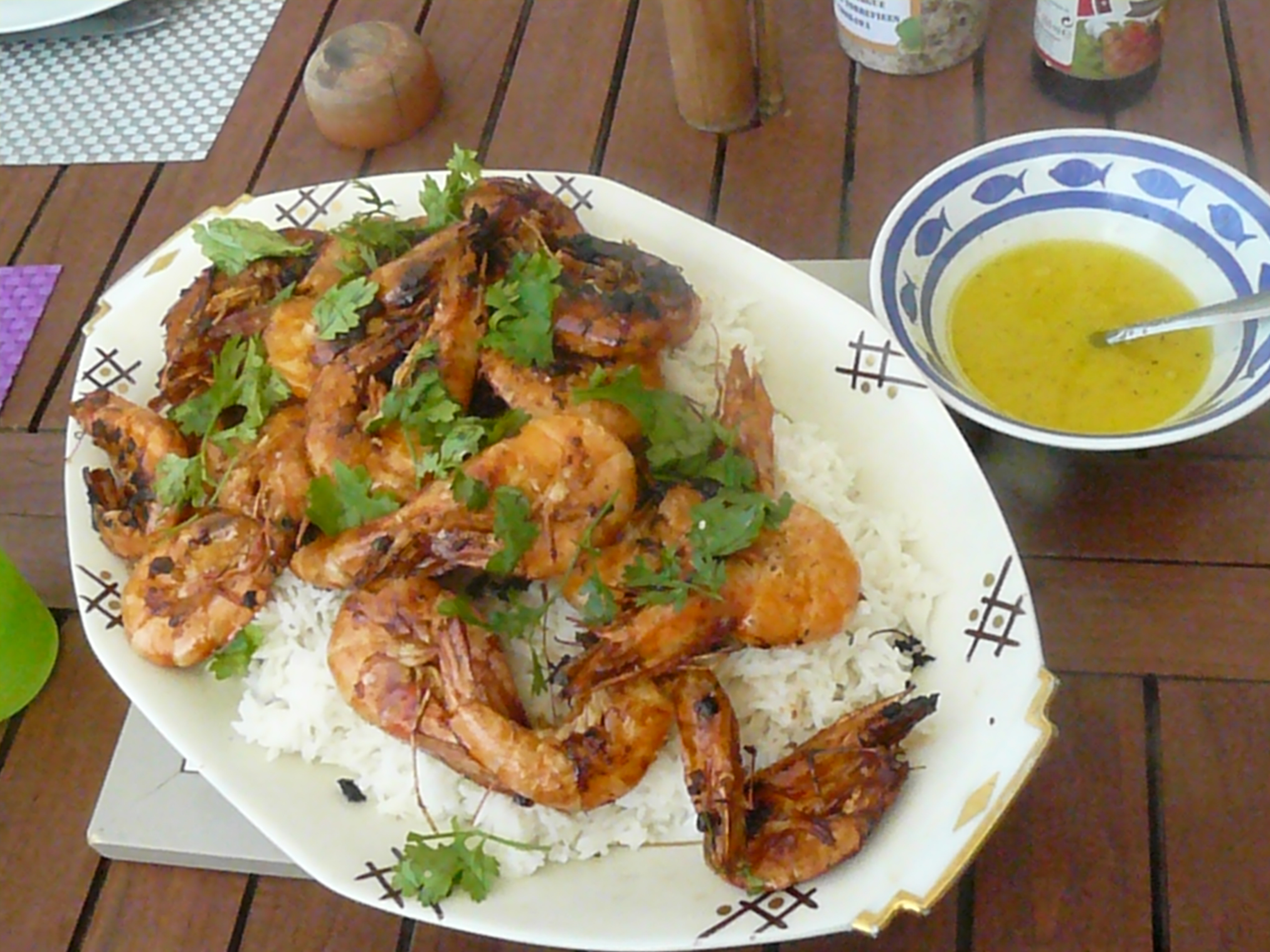 - Tout simplement sur un grand plat, mettre le riz et déposer les gambas dessus avec la coriandre