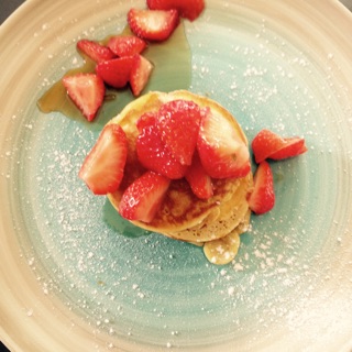 - Servir avec le sirop d’érable et des fraises coupées en deux