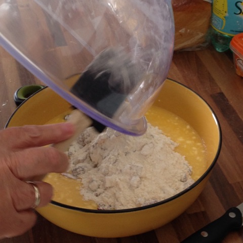 - Dans un saladier, mélanger farine, levure et tous les fruits.