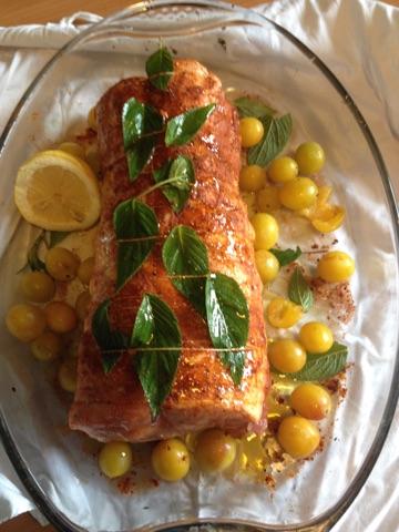 Septembre est la saison des mirabelles, j’étais donc partie pour faire une belle tarte de ces petites merveilles dorées et puis voyant mon beau rôti de porc qui s’attendait à être farci d’ail et de sauge, je me suis dit qu’après tout quelques fruits lui changeraient les idées. C’est parti pour la recette!