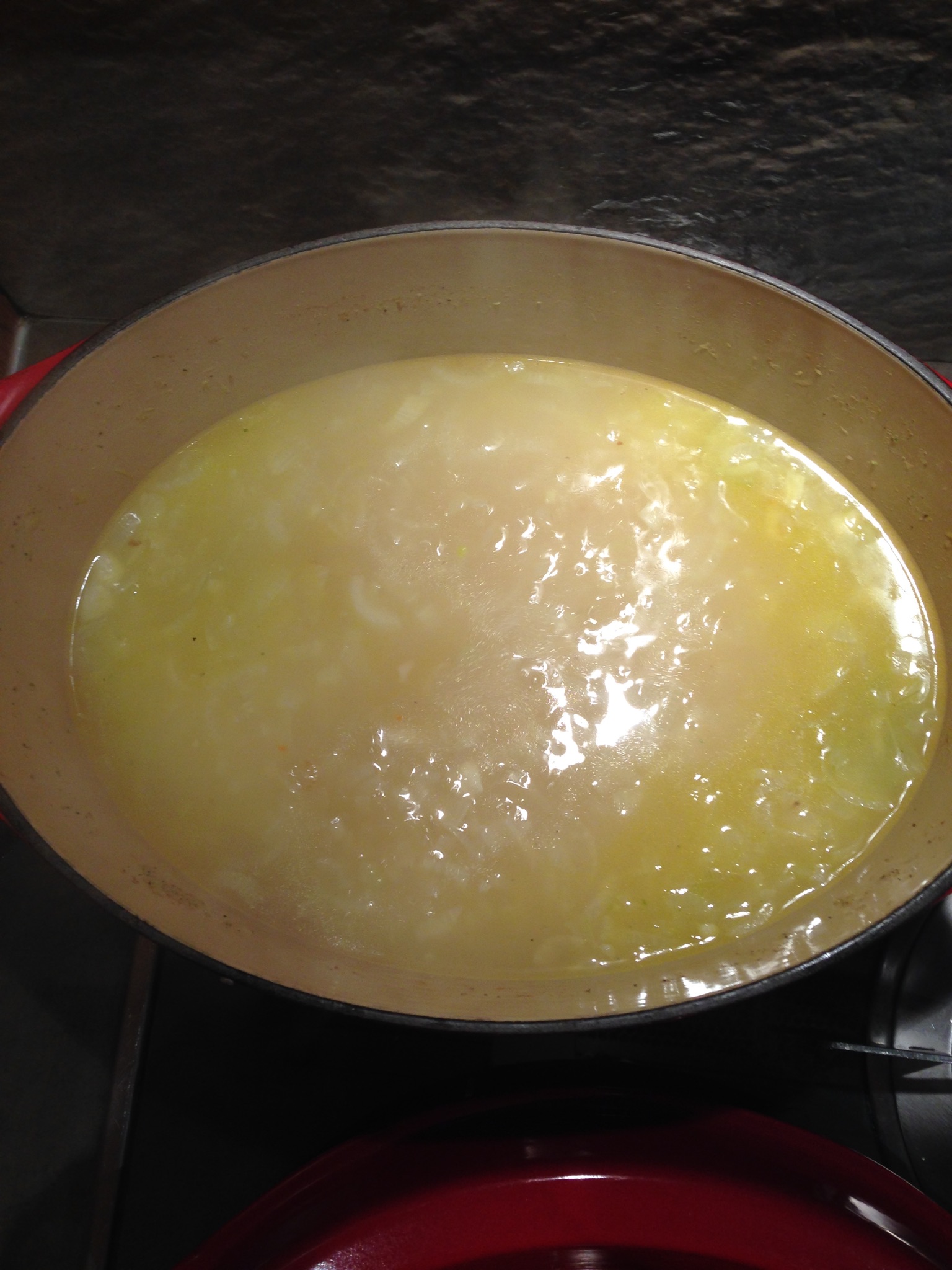 S’il n’y a pas d’enfant vous pouvez ajouter 25 cl de vin blanc en même temps que l’eau, histoire de relever un peu votre soupe, et pourquoi pas quelques pincées de piment d’Espelette!