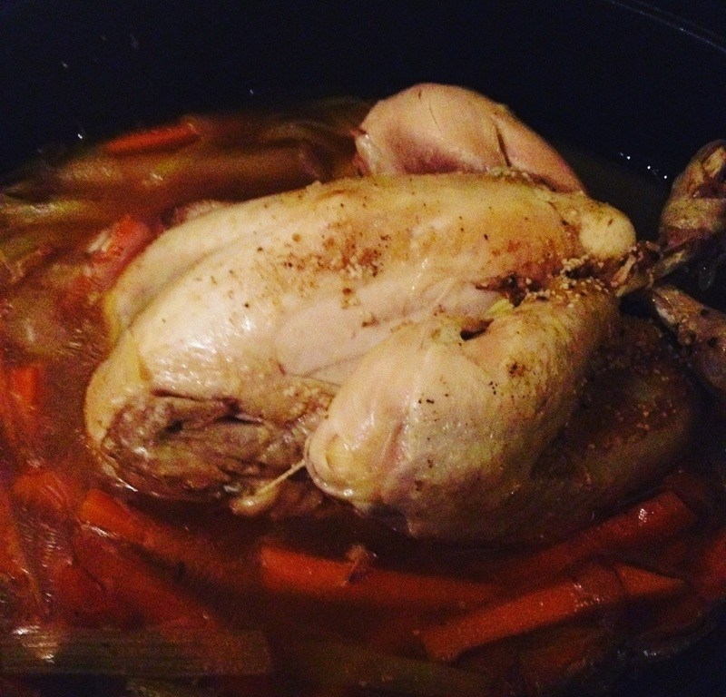 Vous pouvez ajouter une larme de vin blanc dans votre bouillon. Dans tous les cas avec ce genre de cuisson, la chair de votre poulet va se détacher littéralement des os et vous donnera l’impression de déguster une poule au pot, la sauce ivoire en moins. Un plat super light. Les morceaux de citron après 1h30 sont confits et j’ai en plus ajouté de la marinade dans le poulet. Un régal!