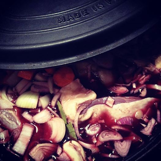 - Mouillez avec le vin de la marinade, ajoutez si besoin du bouillon ou de l’eau pour que les morceaux de coq soient complètement recouverts.