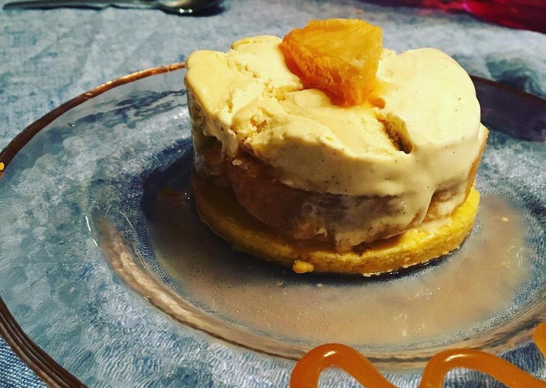 • Répartissez dessus les pommes Tatin, pressez délicatement et ajoutez dessus la glace à la vanille