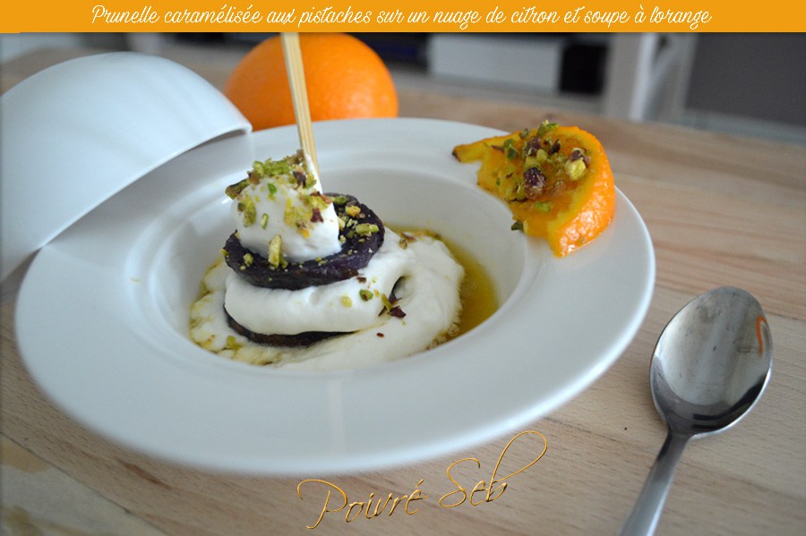 Prunelle-caramélisée-aux-pistaches-sur-un-nuage-de-citron-et-soupe-à-lorange