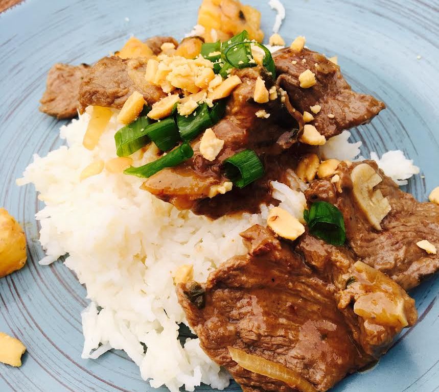 Hier soir, pas trop envie de me lancer dans des choses compliquées, du coup je ressors ma cuisine du placard, à savoir: quoi faire avec les restes du frigo! J’avais de beaux pavés de rumstecks que j’avais pris soin de décongeler la veille, un reste d’ananas en boîte, les herbes de mon jardin et une ribambelle de sauces asiatiques, un sachet ouvert de cacahuètes. Bon et et bien ce sera une wok party prête en 30 minutes et comme je sais que vous adorez tout ce qui est express. Allez hop c’est parti pour la recette!
