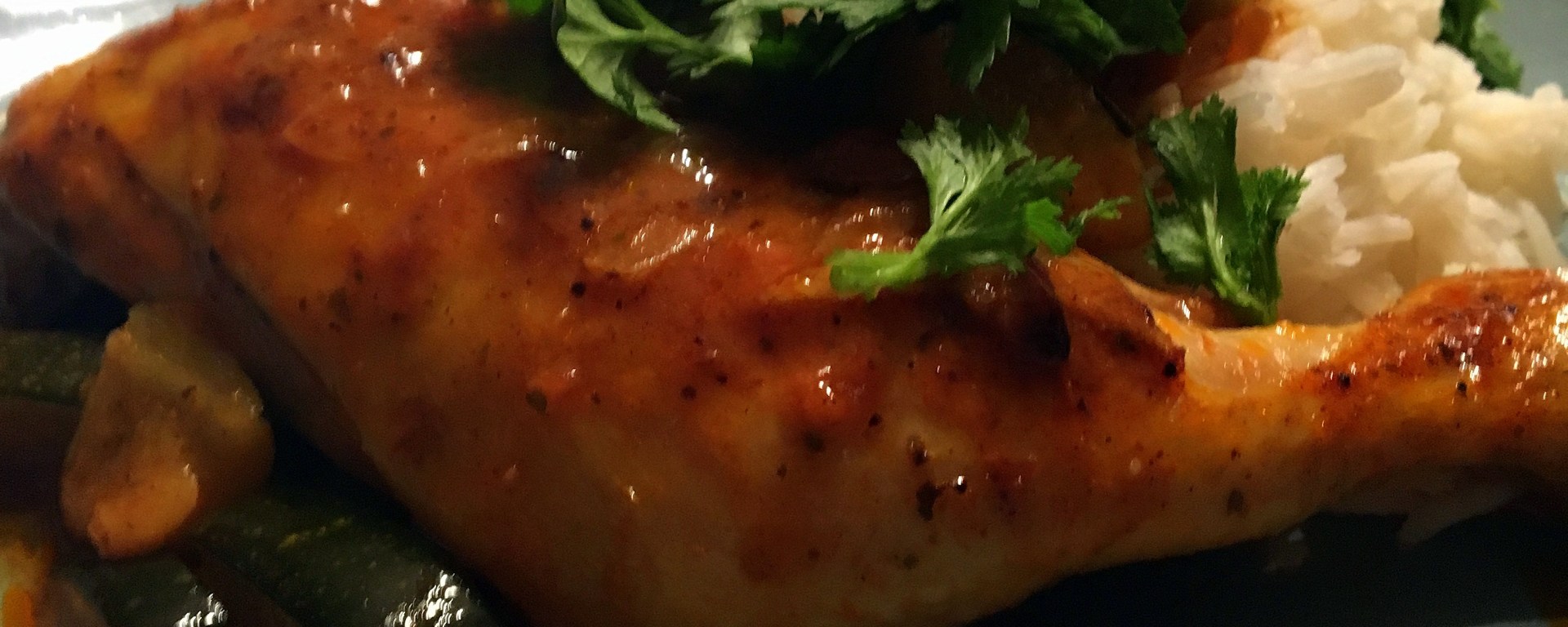 - Servez les cuisses de poulet nappées de sauce avec les courgettes, le riz et la coriandre