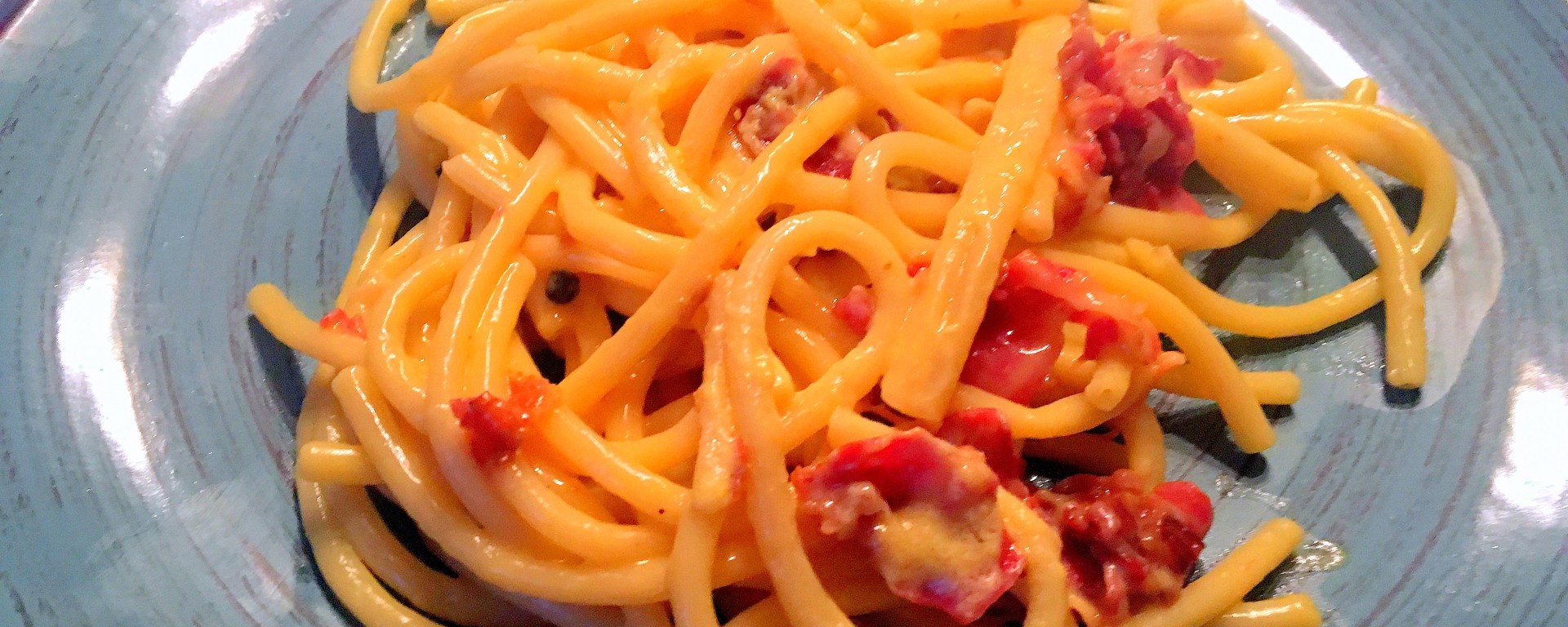 Vous savez déjà que je suis une grande fan de la cuisine italienne, cette fois-ci, j’ai décidé de me lancer dans les véritables pâtes à la carbonara et pour cela, j’ai pioché une recette de la talentueuse Laura Zavan, auteur d’une douzaine de livres de cuisine italienne et que j’ai eu la chance de croiser sur l’émission La Quotidienne la Suite l’année dernière. Laura officie dans l’excellent magasine Saveurs et quand j’ai vu sa recette, je n’ai pas pu résister. Elle utilise des spaghettoni qui sont des gros spaghettis, mais comme je n’en ai pas trouvé, j’ai pris des bucatinis que je n’avais jamais testés auparavant. Ce sont des pâtes longues et creuses qui s’accommodent parfaitement à la carbonara. Et je peux vous dire que dans cette recette nul besoin de crème, et chez moi ils ont été bluffés 😉 Allez hop c’est parti pour la recette!