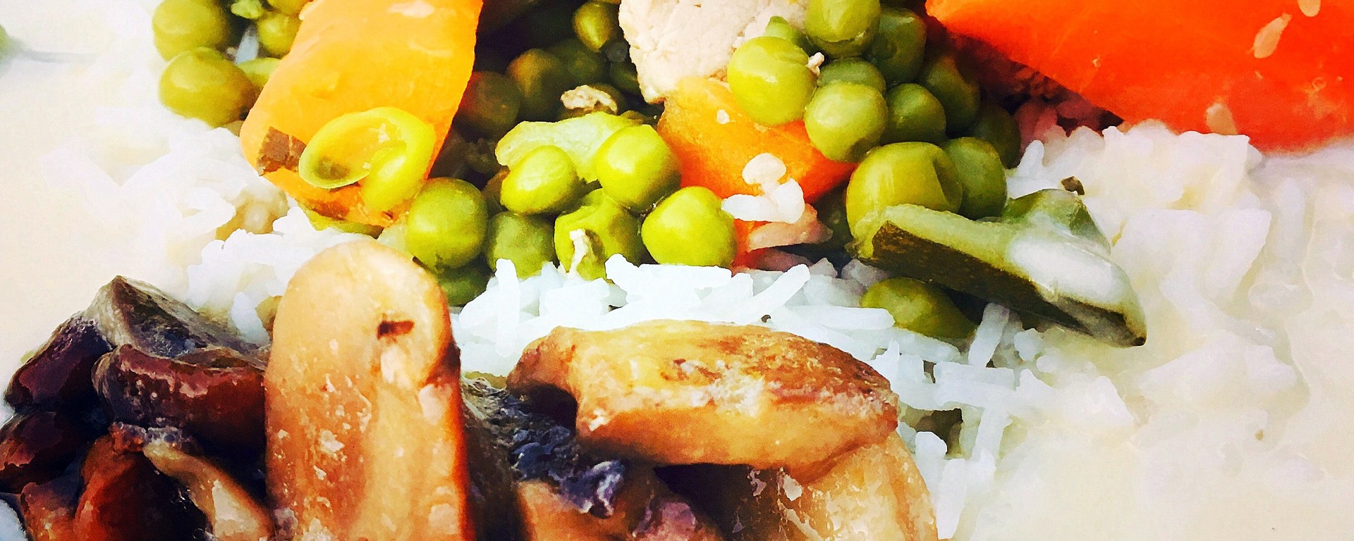 • Servez cette jolie blanquette avec les légumes, le riz, les champignons ,quelques herbes et nappez de sauce blanche