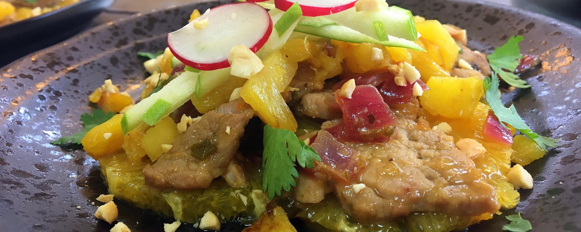 • Mélangez le filet mignon, la coriandre et l’ananas dans un saladier puis répartissez ce mélange sur les rosaces d’orange. Ajoutez un peu de marinade cuite et parsemez sur le dessus les bâtonnets de pomme et les cacahuètes hachées et quelques radis coupés en lamelles