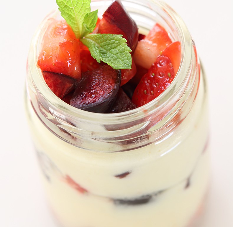 - Disposez les biscuits imbibés au fond de la verrine, ajoutez quelques fruits rouges, une couche de crème mascarpone à la moutarde, encore des fruits et décorez avec une feuille de menthe