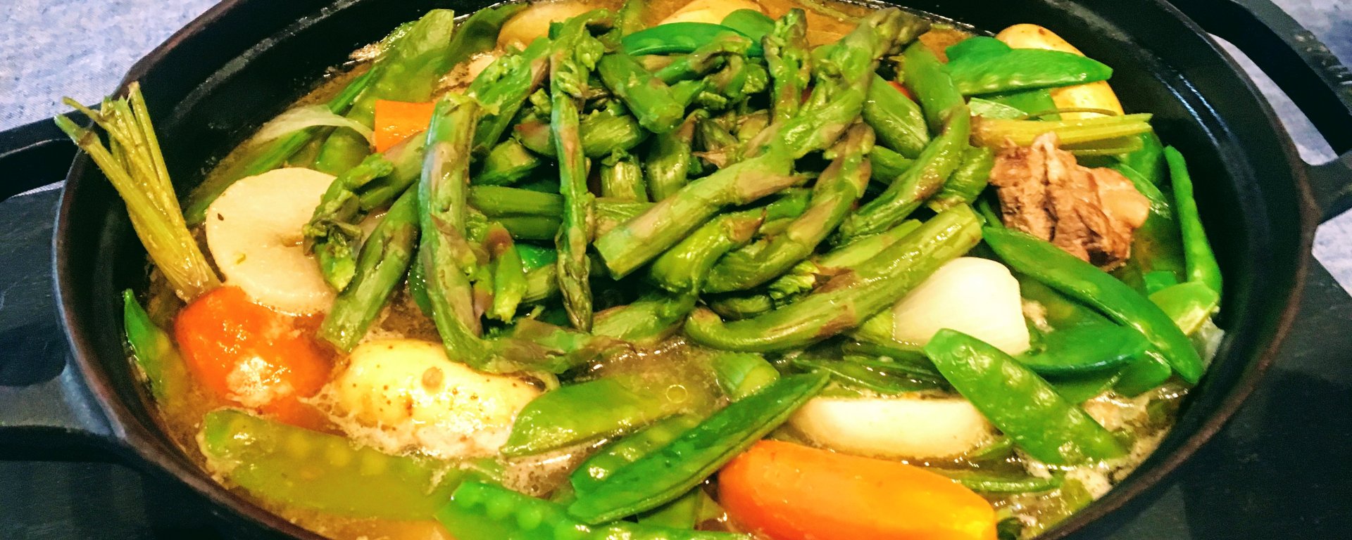 Finalement, le plus long est la cuisson des légumes surtout quand on a pas un piano de chef. Du coup, j’ai fait cuire ensemble, les hauts de carottes, les pois gourmands et les oignons blancs, et j’ai stoppé la cuisson au fur et à mesure selon les légumes. Pour les navets, vu que le goût est plus prononcé, je les ai fait à part.Au final, c’est un plat haut en couleur, et la viande fondant à souhait.