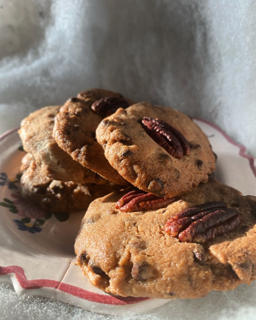 On finit l’année avec une jolie recette de cookies aux noix de pécan, mais vegan. Nous explorons toutes les formes de cuisines chez nous et depuis quelques temps les recettes vegan. Ma fille Chiara a pris l’habitude d’en faire car sa bassiste est végan. C’est d’ailleurs elle qui nous a donné la recette. C’est un délice à tester absolument.